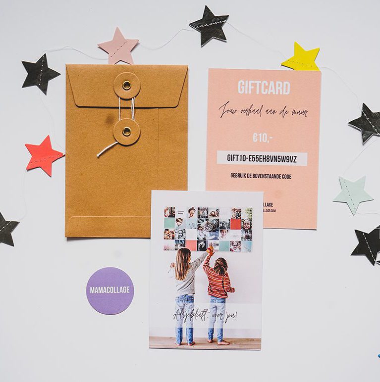 Met een Mamacollage giftcard geef je een origineel cadeau. Deze giftcard is te gebruiken voor het maken van alle Mamacollage producten. Verras je familie en vrienden en geef ze het meest persoonlijke cadeau voor aan de muur. Kies het gewenste bedrag en ontvang de giftcard in een leuke cadeauverpakking. Voor €1,99 heb je de giftcard per post binnen 1-3 werkdagen in huis.