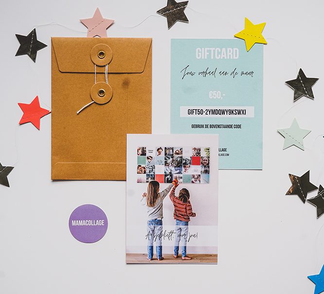 Met een Mamacollage giftcard geef je een origineel cadeau. Deze giftcard is te gebruiken voor het maken van alle Mamacollage producten. Verras je familie en vrienden en geef ze het meest persoonlijke cadeau voor aan de muur. Kies het gewenste bedrag en ontvang de giftcard in een leuke cadeauverpakking. Voor €1,99 heb je de giftcard per post binnen 1-3 werkdagen in huis.