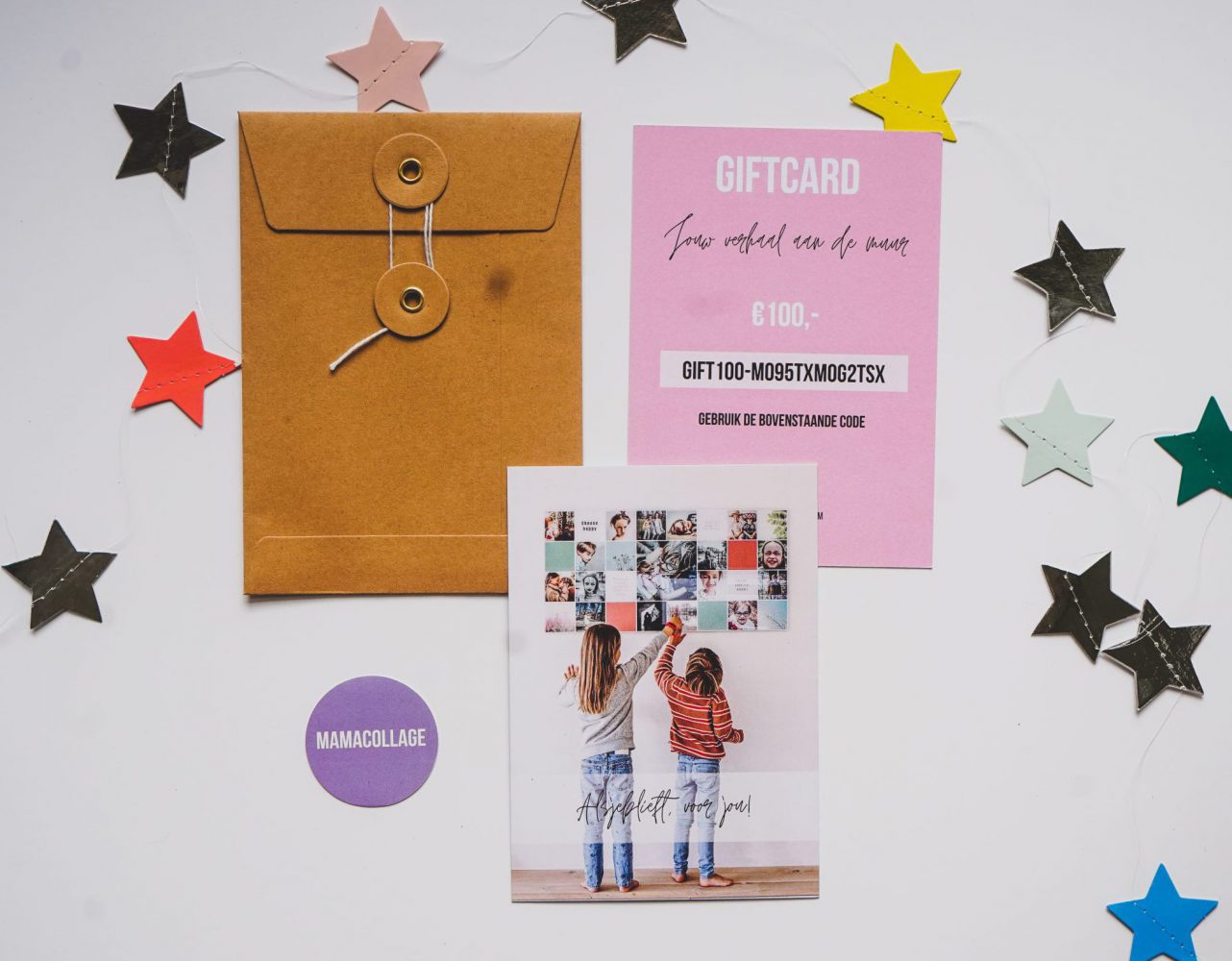 Met een Mamacollage giftcard geef je een origineel cadeau. Deze giftcard is te gebruiken voor het maken van alle Mamacollage producten. Verras je familie en vrienden en geef ze het meest persoonlijke cadeau voor aan de muur. Kies het gewenste bedrag en ontvang de giftcard in een leuke cadeauverpakking. Voor €1,99 heb je de giftcard per post binnen 1-3 werkdagen in huis.
